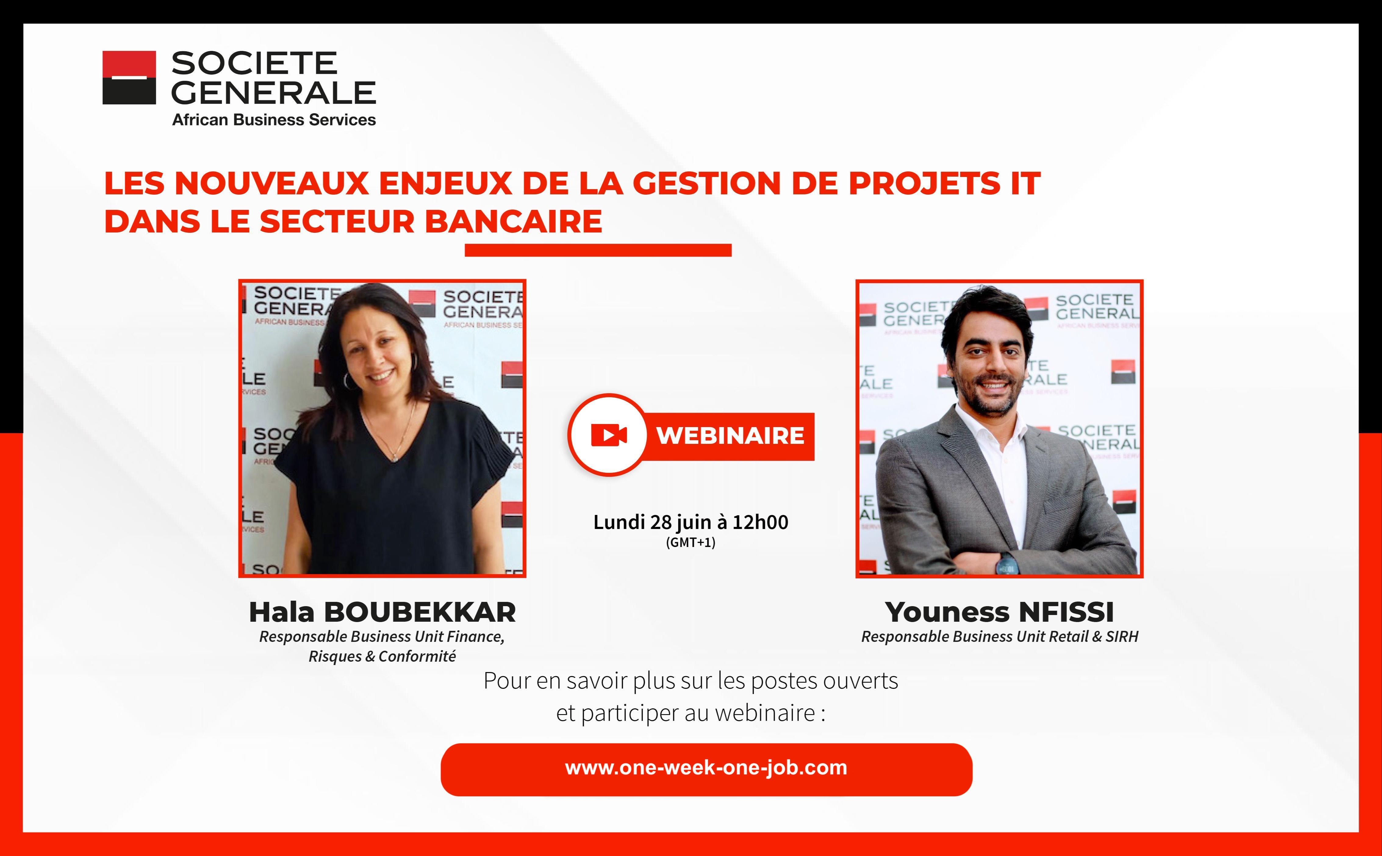 À la veille du lancement du One Week One Job, l'évènement de recrutement de Société Générale African Business Services, un webinaire dédié aux nouveaux enjeux de la Gestion de Projets IT dans le secteur bancaire, animé par Hala Boubekkar, Responsable Business Unit Finance, Risques & Conformité et Youness Nfissi, Responsable Business Unit Retail & SIRH, vous permettra de mieux comprendre les dimensions des postes proposés et d’échanger en direct sur leurs enjeux.